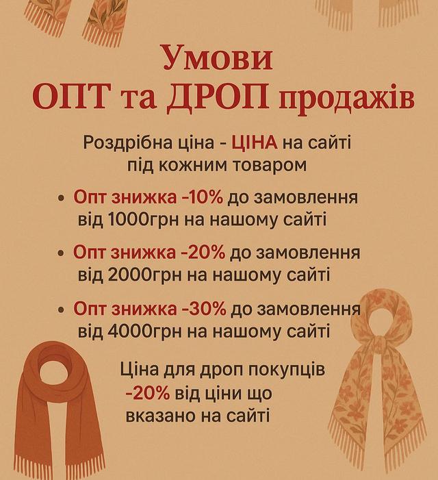 ОПТОВА ЦІНА -30% на замовлення сумою від 4000 грн. та для постійних оптових клієнтів.