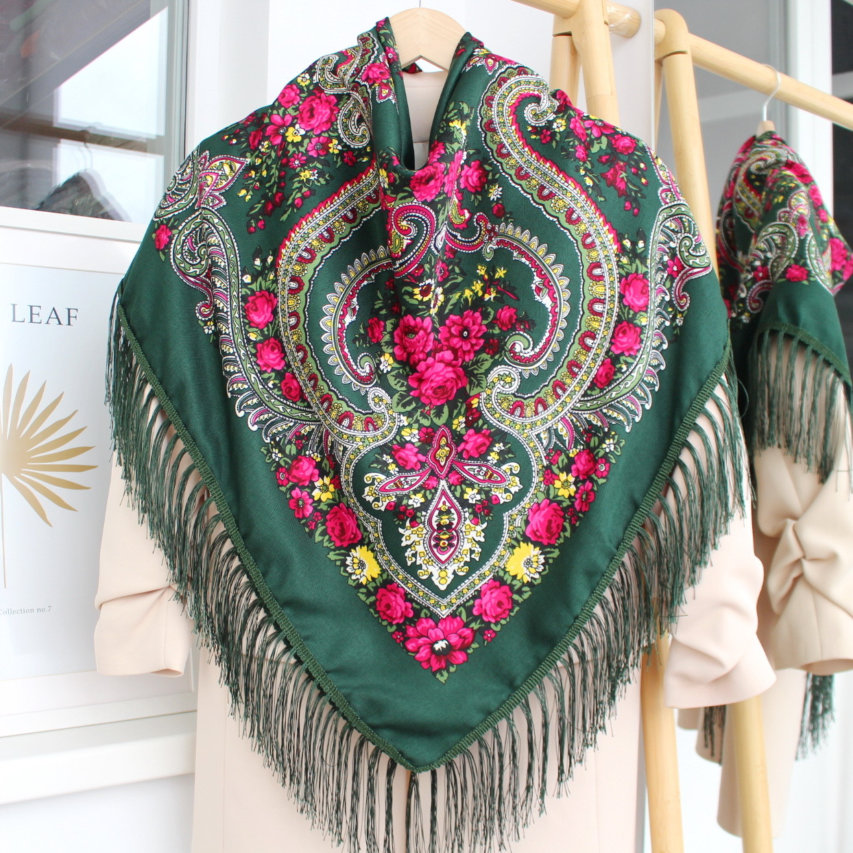 Хустку можна пов’язати на голову або покласти на плечі. Шовкові китиці прикрашають виріб з чотирьох сторін по краям. Купити хустину можна у нашому магазині за доступною ціною. Існує система знижок для гуртових клієнтів та колективів.